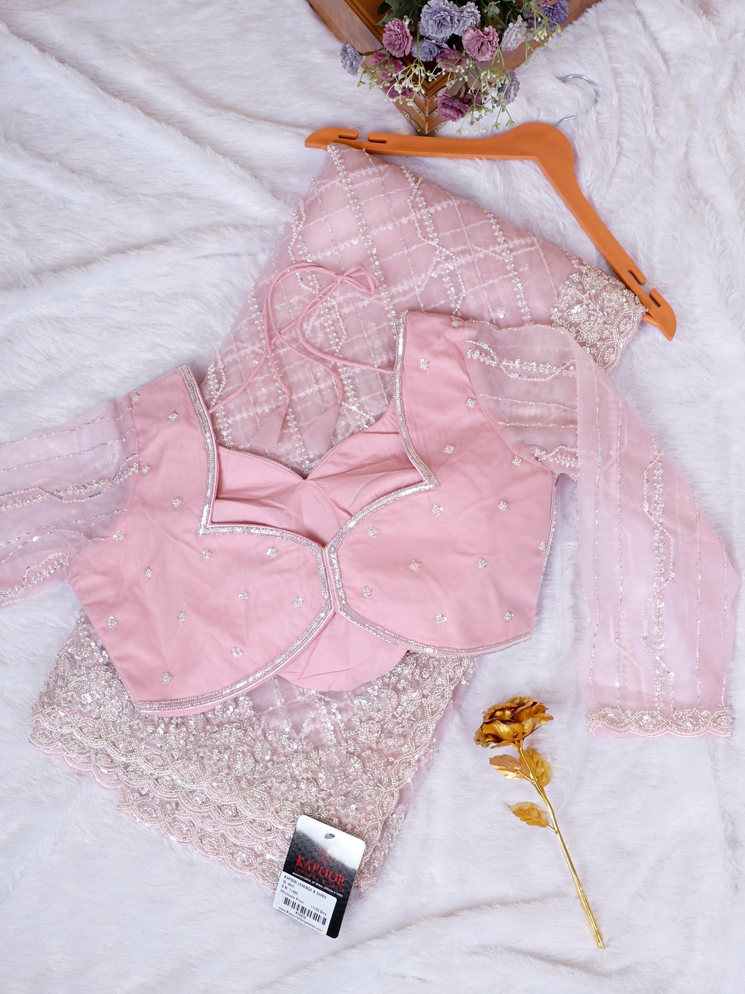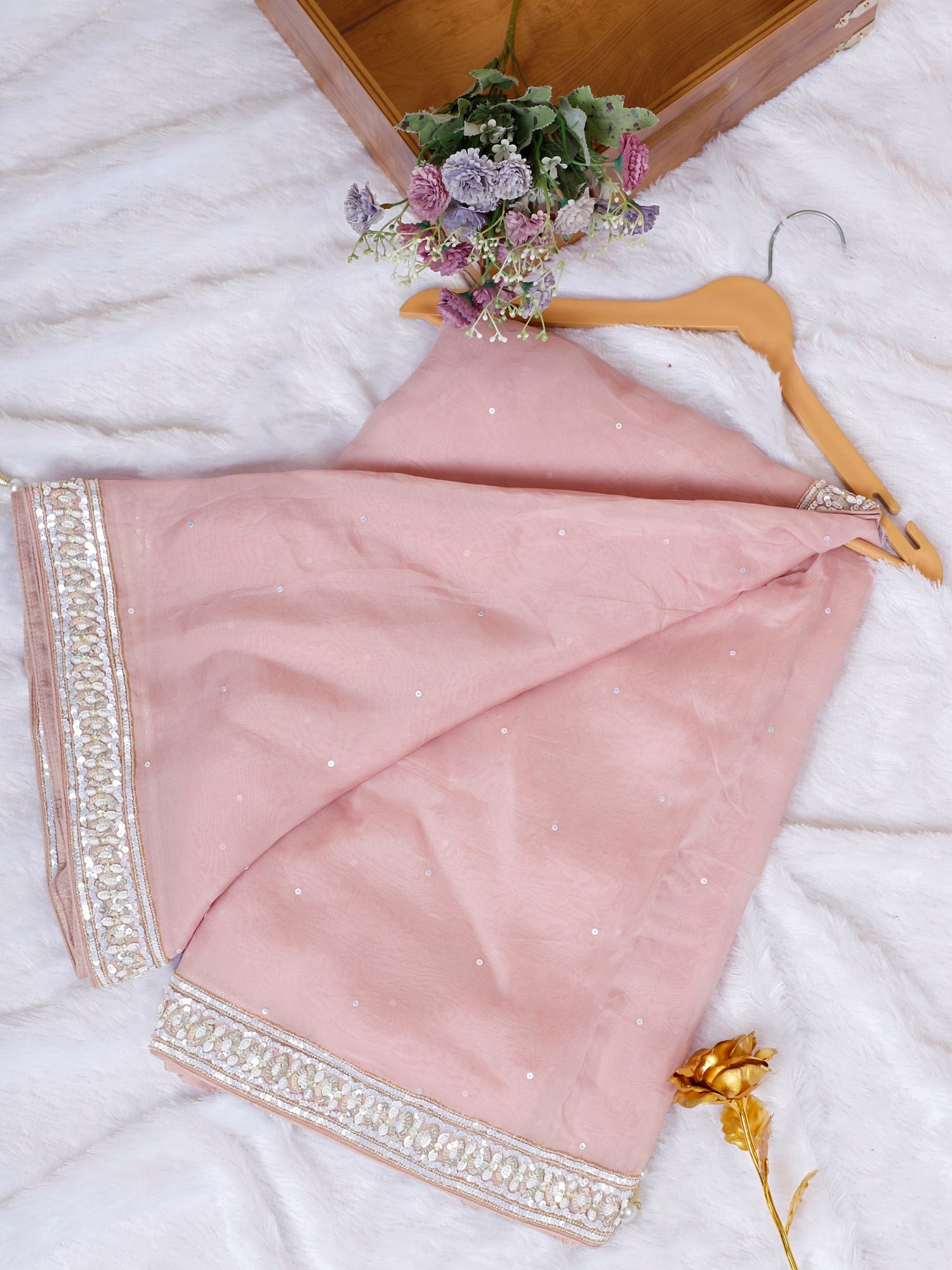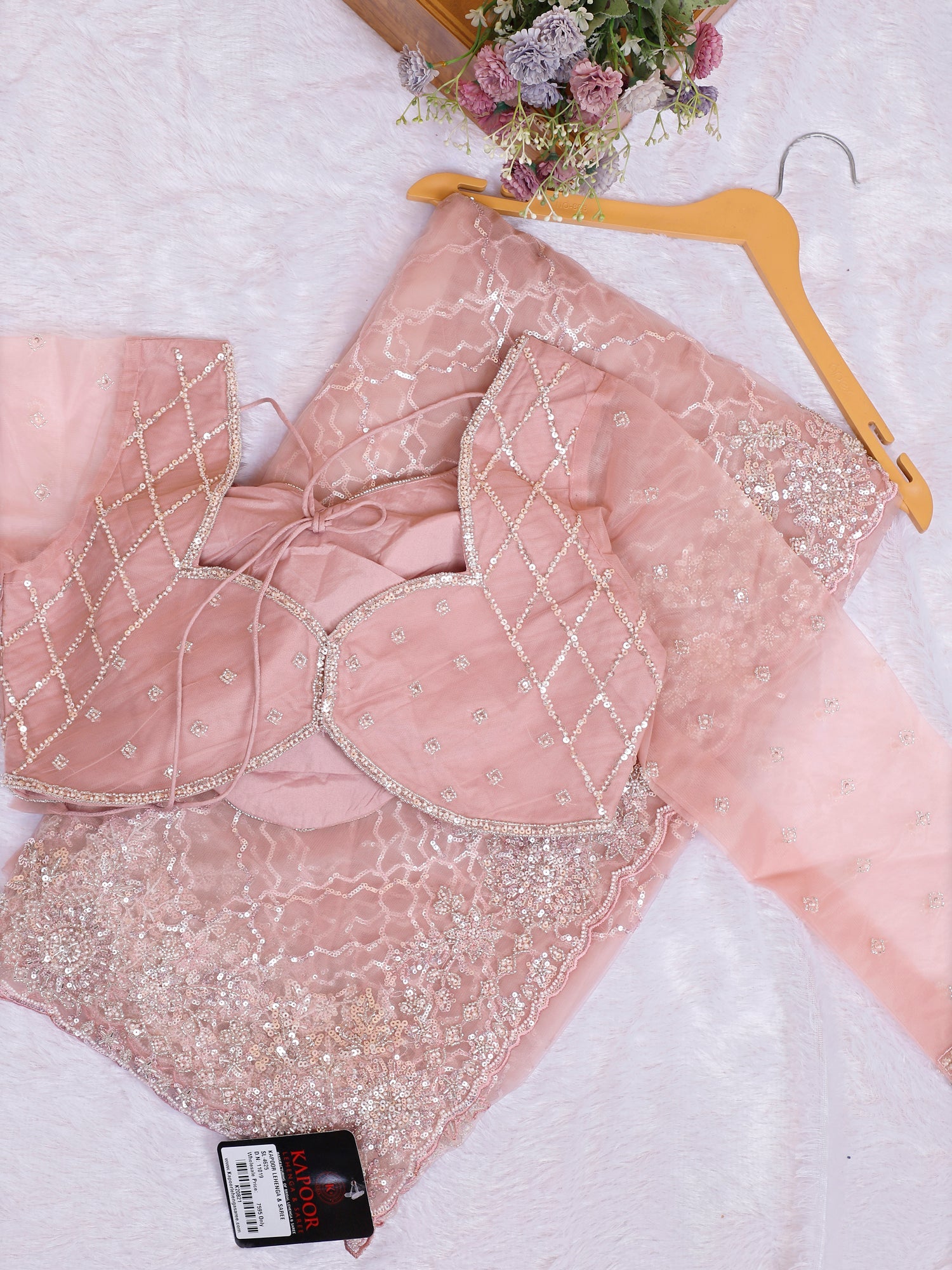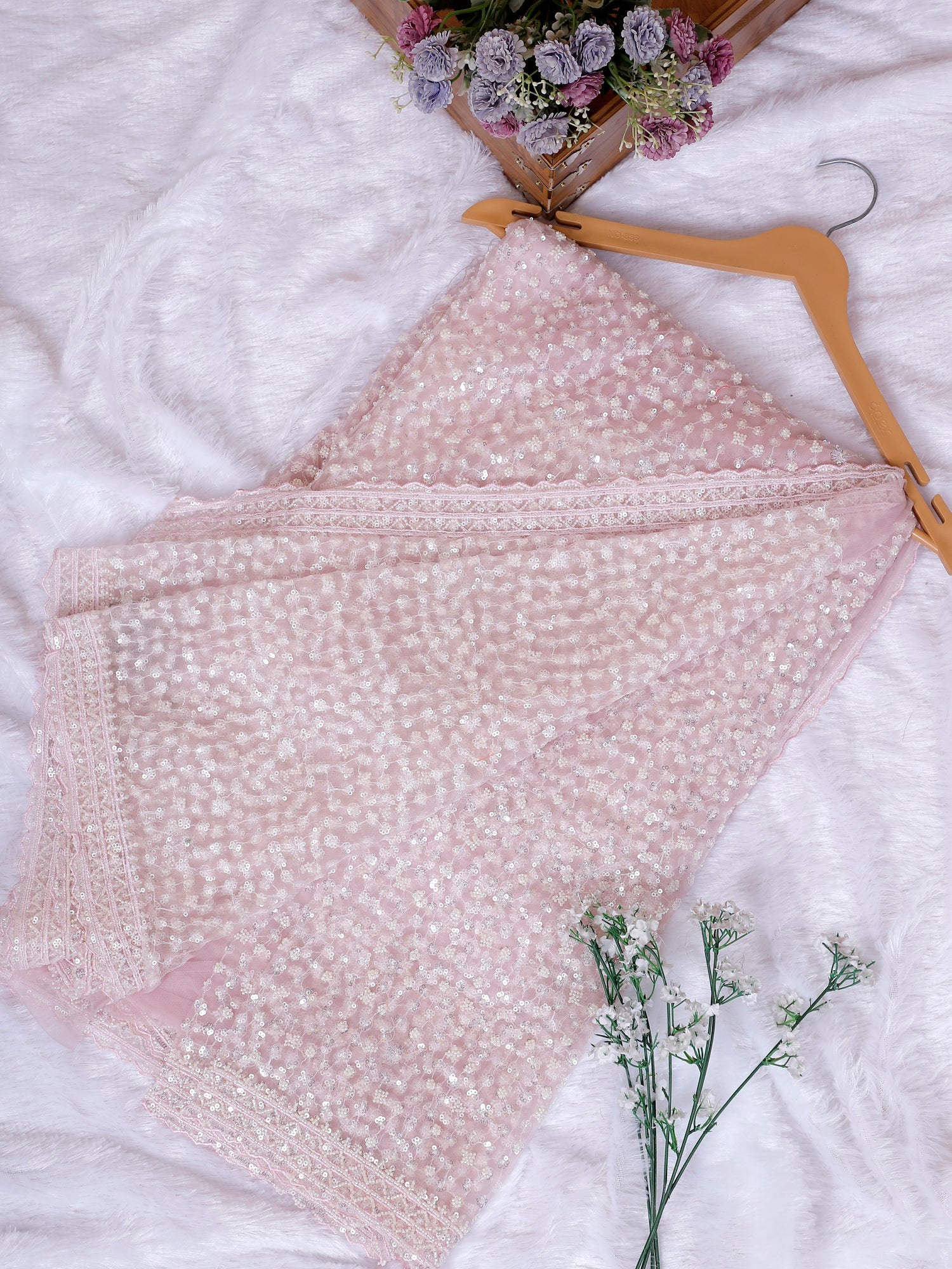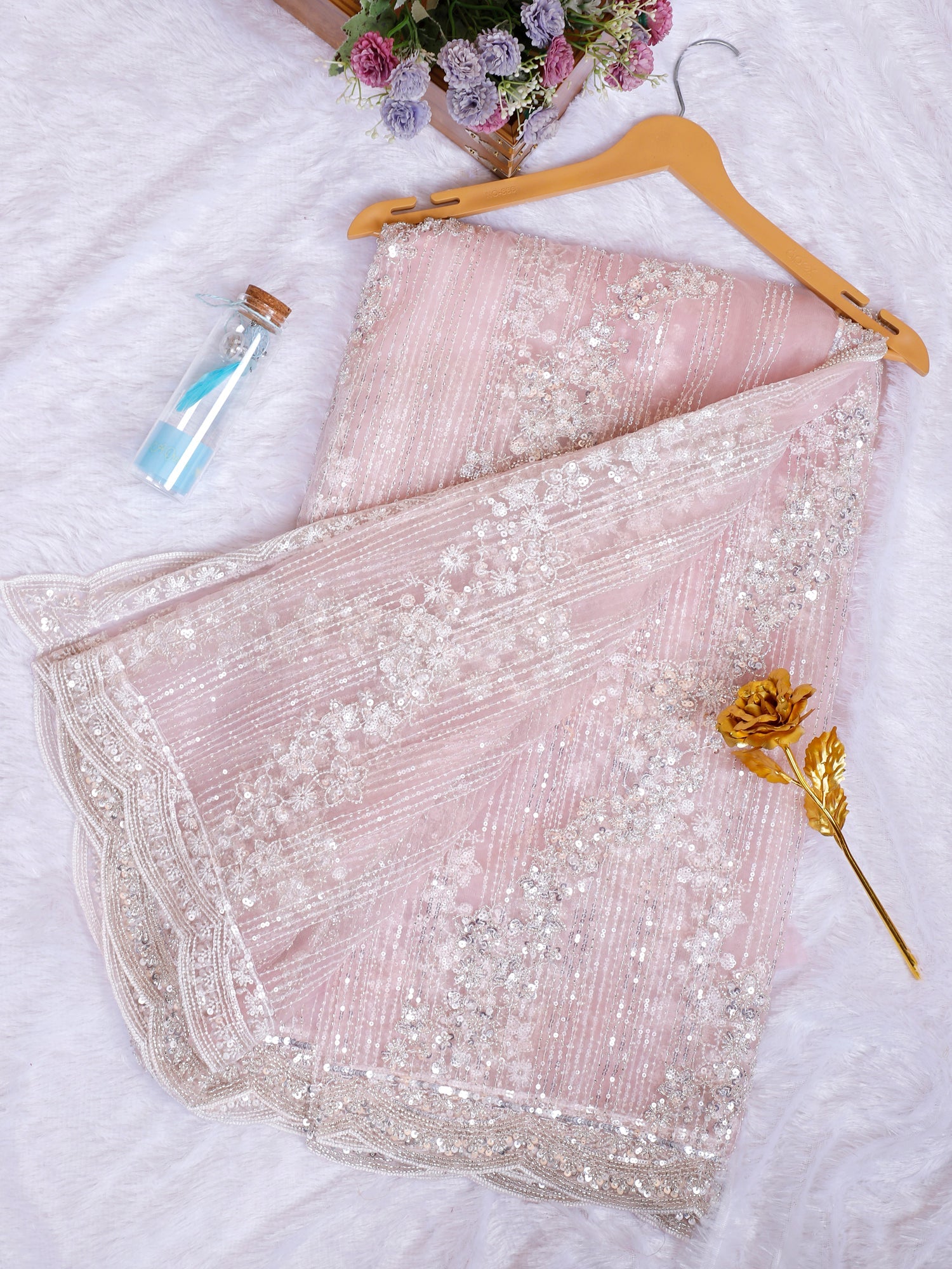Light Pink Net Sequin Handwork Saree For Wedding & Party Wear