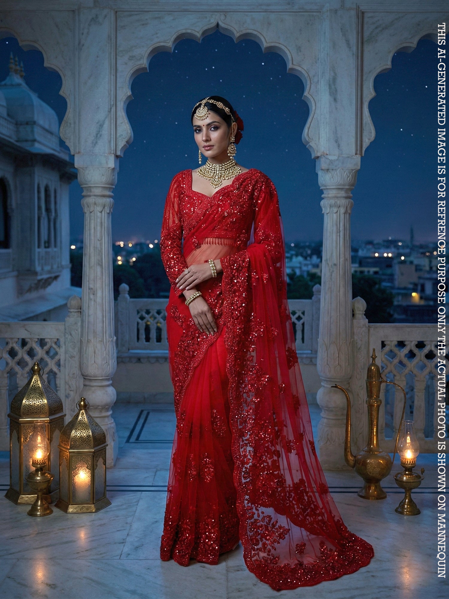 Red Laal Fakhr-e-Zeenat Net Sequin Beads Handwork Saree
