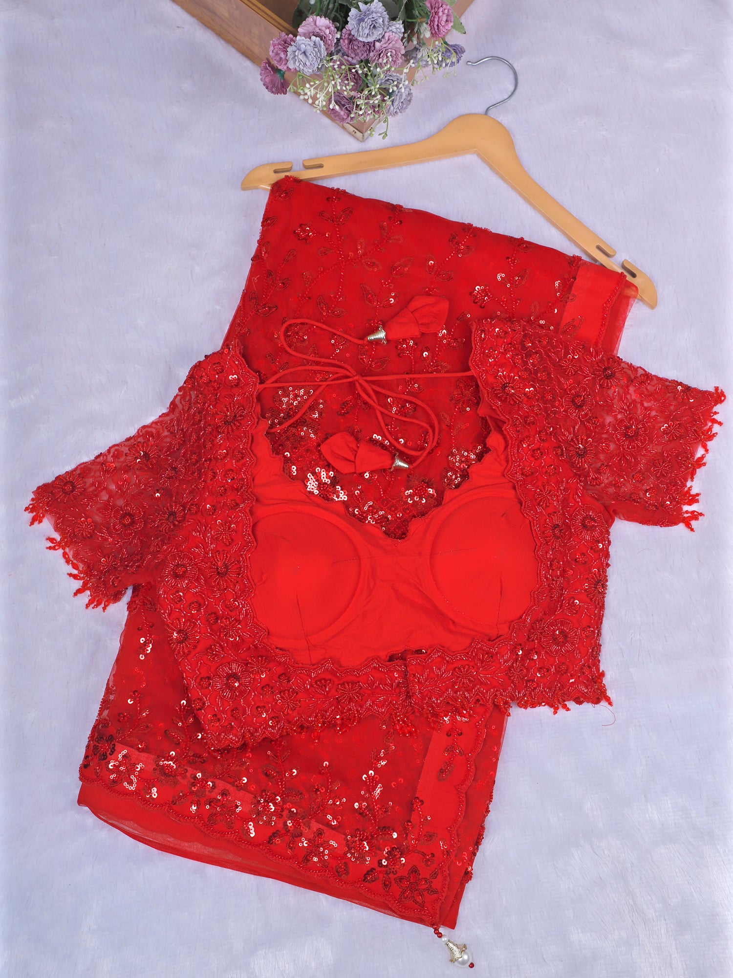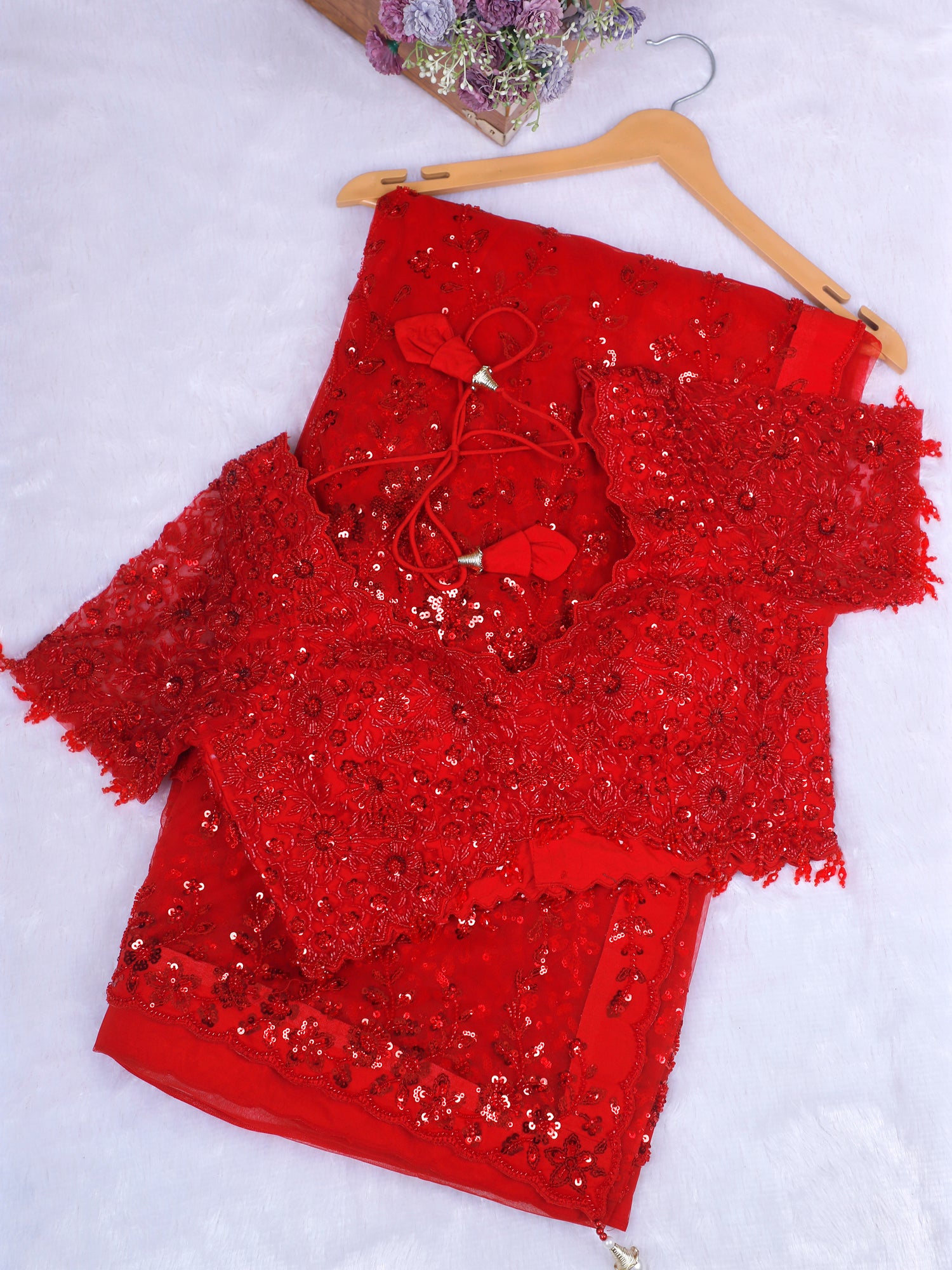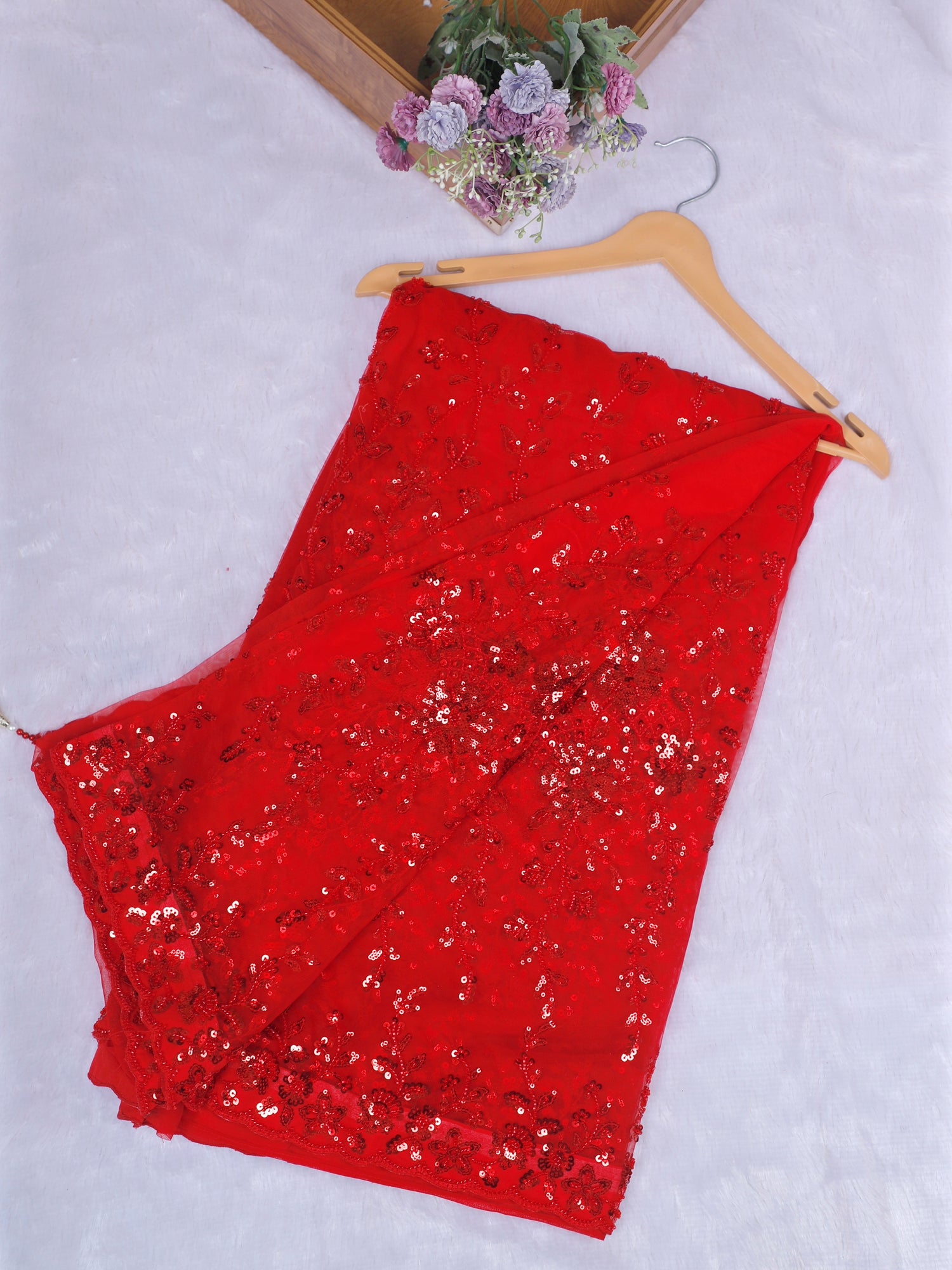 Luxury Red Crepe Silk Sequin Work Party Wear Saree
