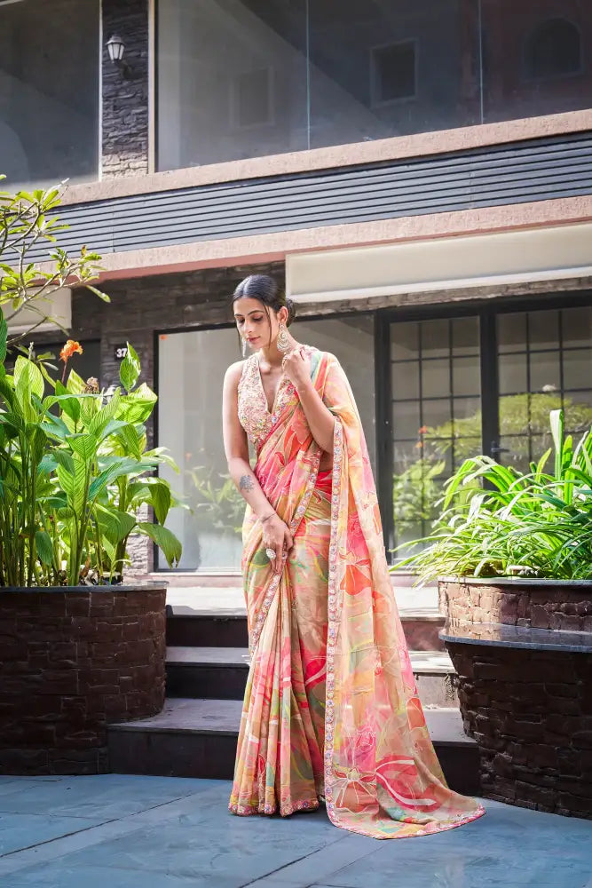 This saree mixes tradition and modern style. The charm of the digital print gives a contemporary feel, while the luxury of embroidery follows the richness of authentic Karwa Chauth attire, offering a unique design that is stylish and appealing for festive events.