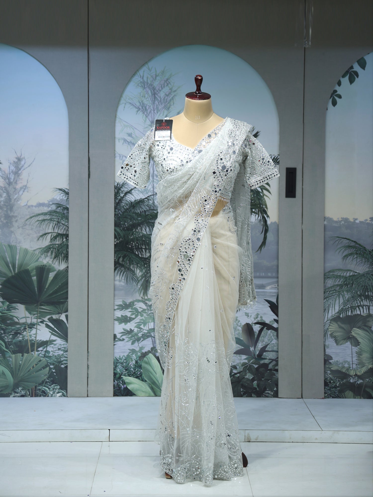 Off White Organza Designer Saree with Heavy Embroidery Work