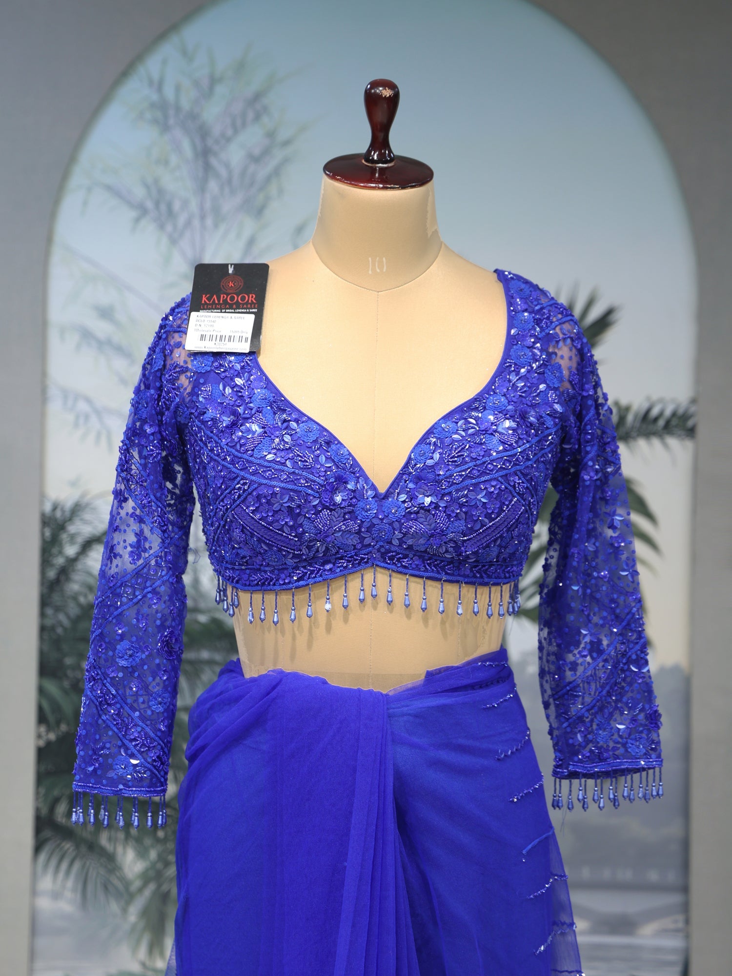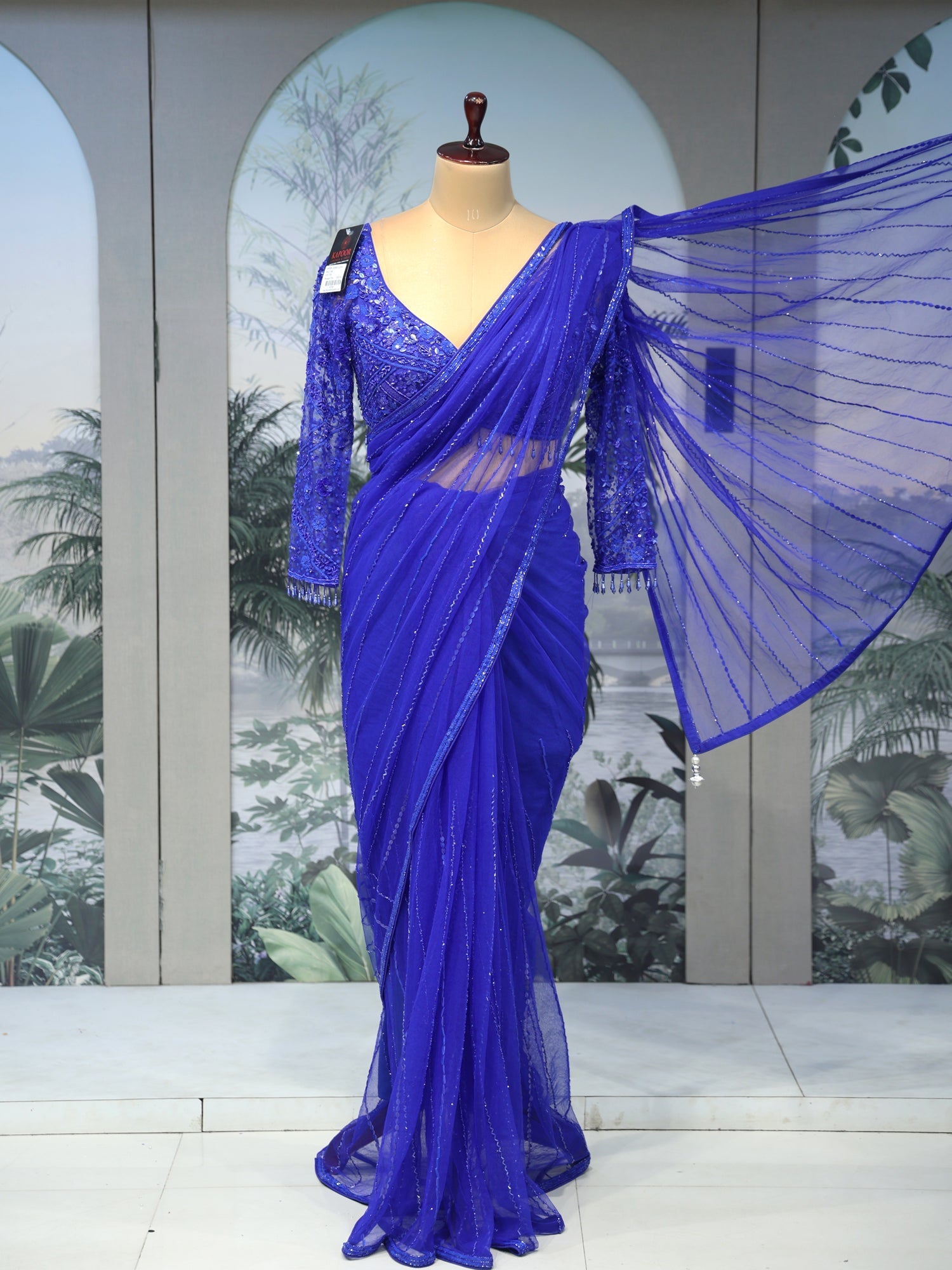 Blue Sapphire Bloom Net Sequin Handwork Royal Saree