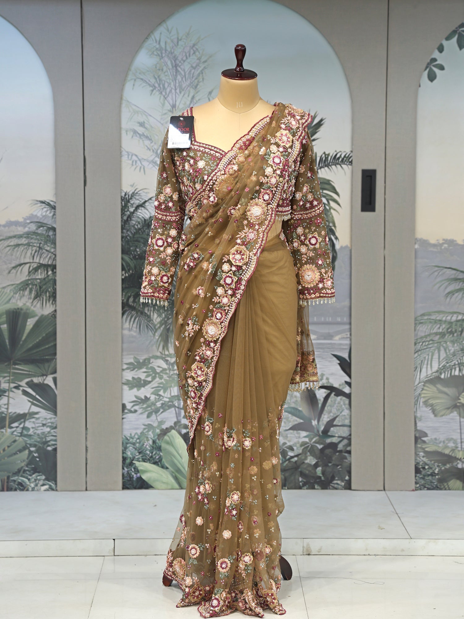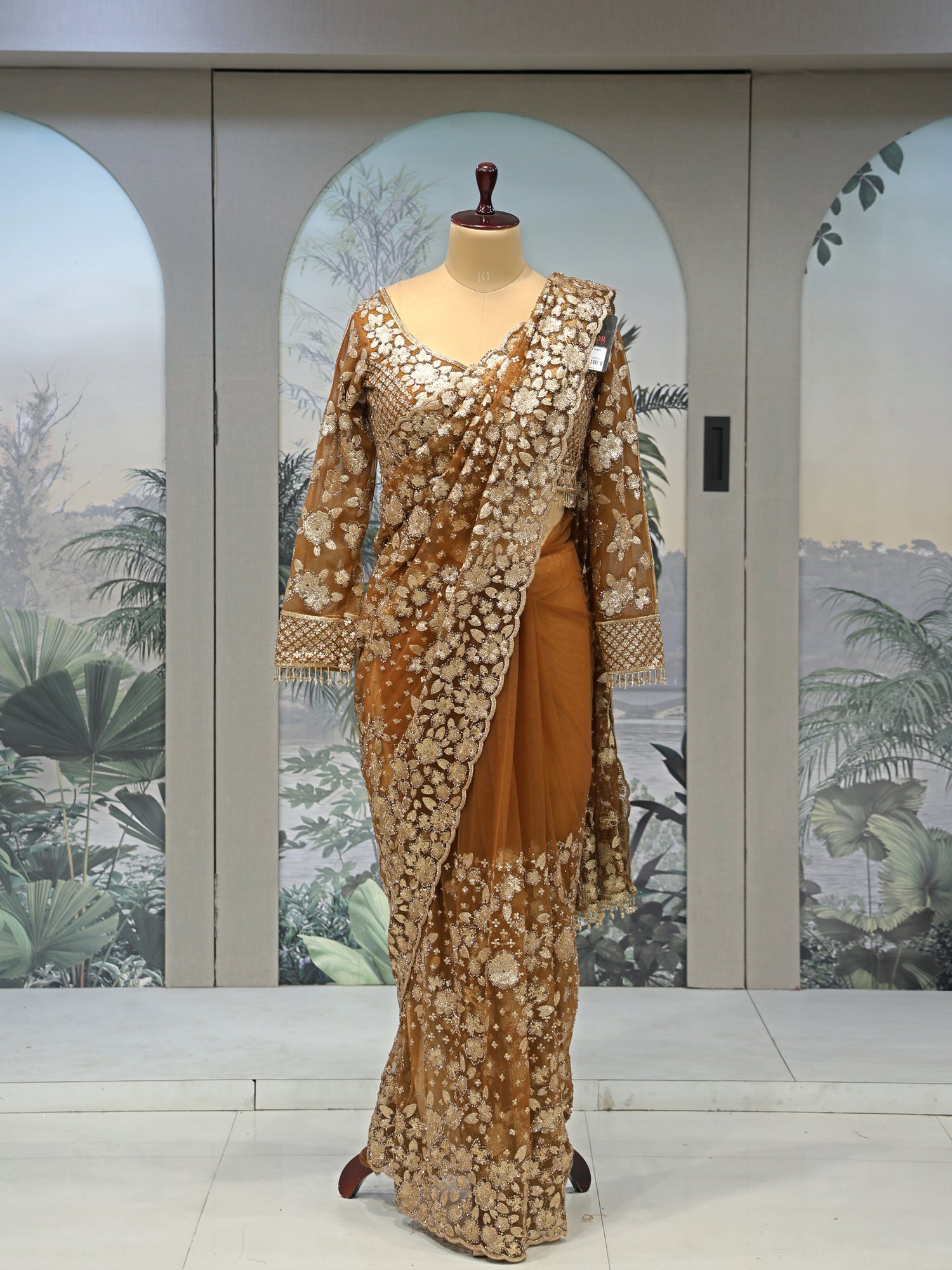 Brown Amber Queen Exclusive Diamond Embroidery Net Saree