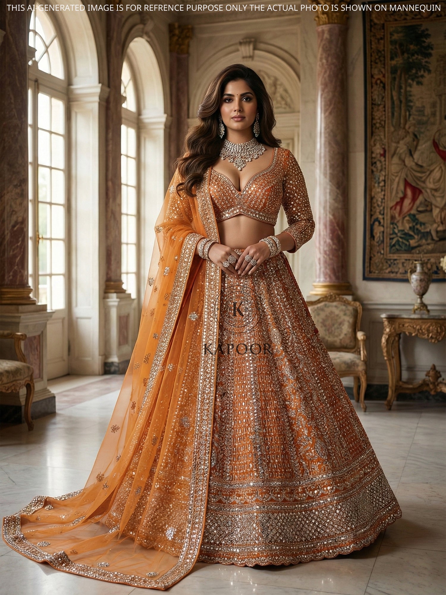 Rust Orange Signature Net Lehenga With Jarkan, Mirror & Sequin Glow