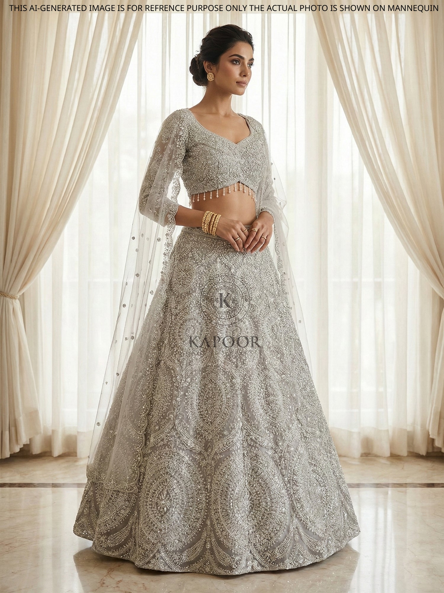 Silver Frostline Elegance Net Lehenga With Thread & Jarkan