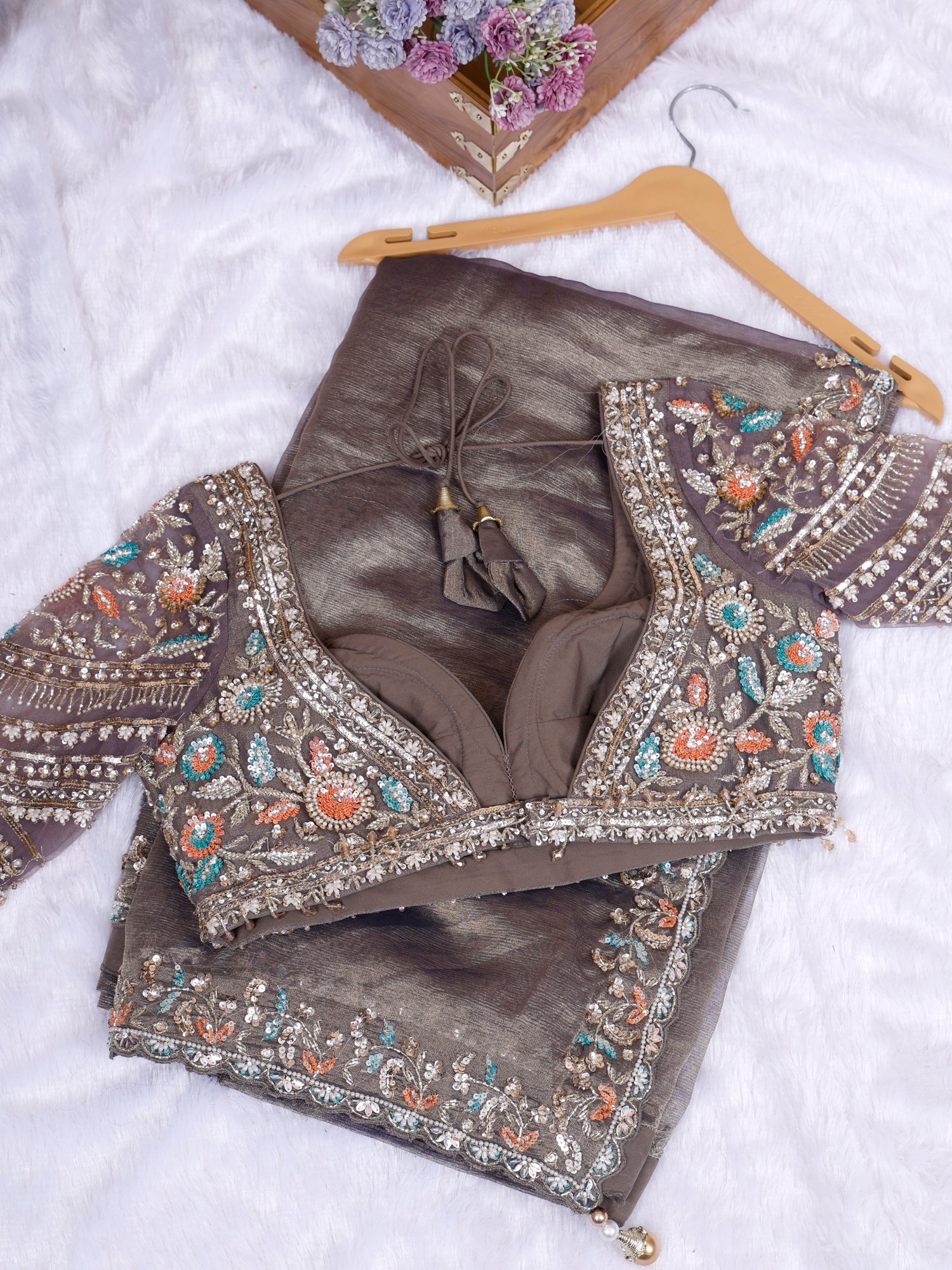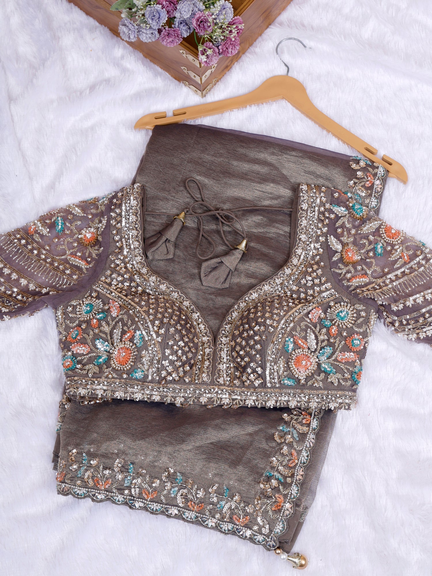 Metallic Grey Net Saree With Premium Handcrafted Details