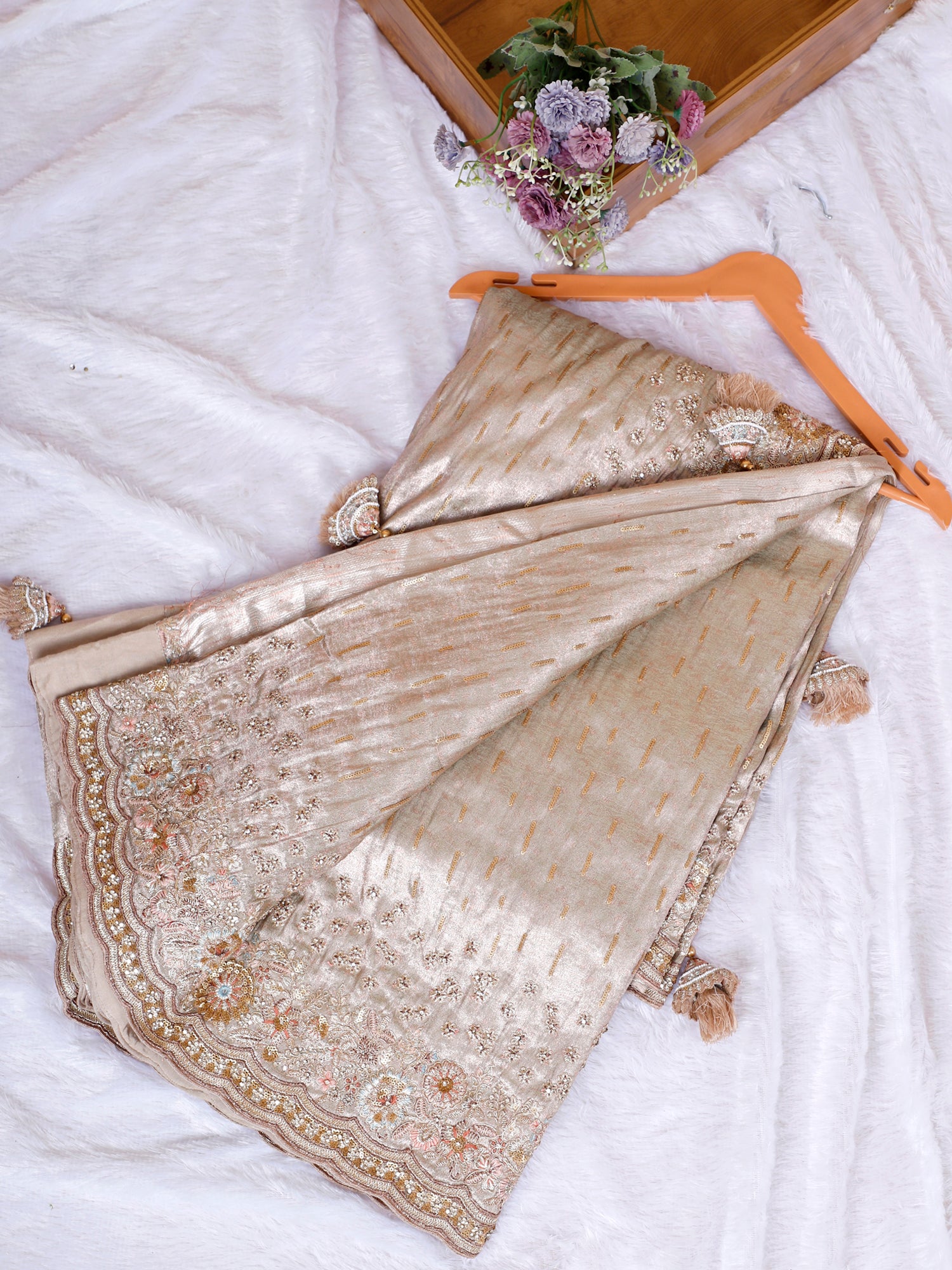 Designer bridal sarees are more appropriate for cocktail celebrations due to their bold nature. They also incorporate heavier fabrics coupled with detailed embroidery, stonework, or sequined embellishments. Sarees for parties are surely attention grabers whether they are stonework, or zari work style.