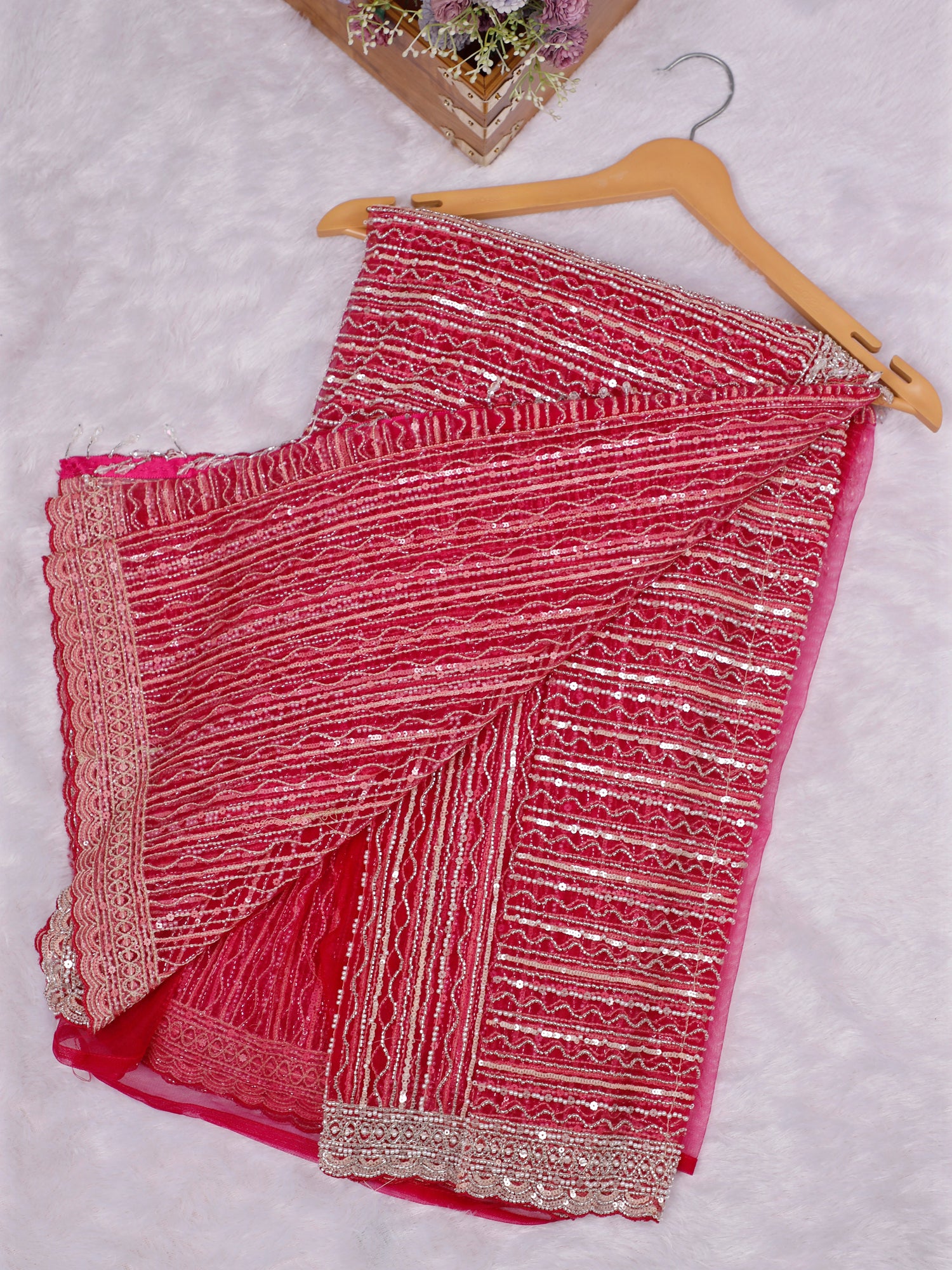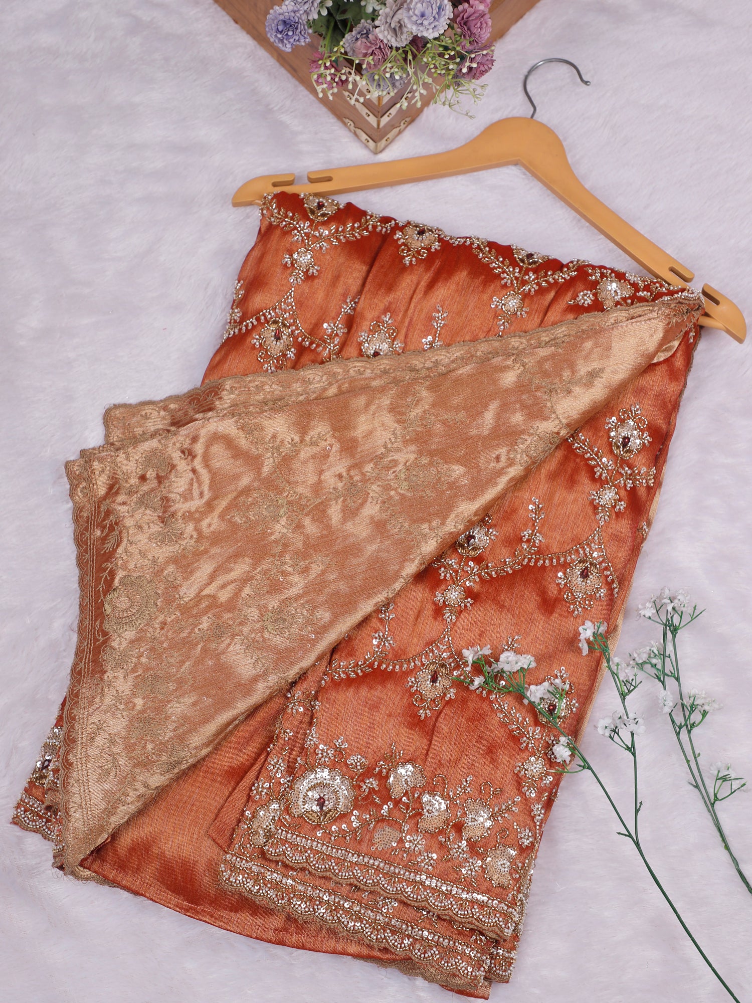 Designer bridal sarees are more appropriate for cocktail celebrations due to their bold nature. They also incorporate heavier fabrics coupled with detailed embroidery, stonework, or sequined embellishments. Sarees for parties are surely attention grabers whether they are stonework, or zari work style.